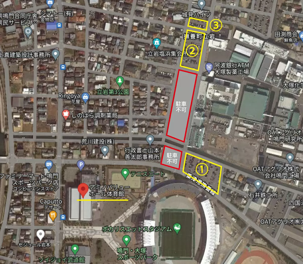 ※近隣の大塚製薬工場1番、9番駐車場は駐車不可となりますのでご注意ください。